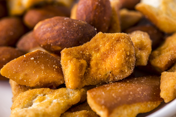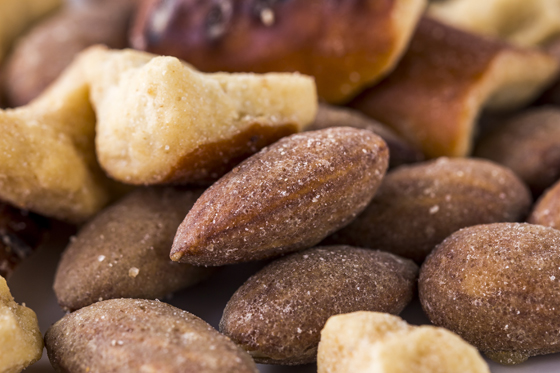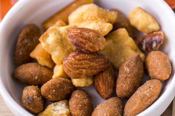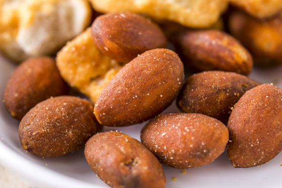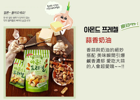 奶油大蒜香料杏仁:烘烤杏仁,奶油大蒜香料調味料(大蒜麵包香料粉(薑黃油奶油香料、麵包香料、焦糖香料粉甜味劑(甜菊糖苷)、烤大蒜香料、大蒜萃取粉;奶油香料粉、烤大蒜粉、麥芽糊精、烤洋蔥粉、醬油粉、果糖、鹽),糖粉,糖,玉米糖漿,麥芽糊精,奶油大蒜香料